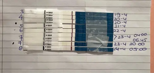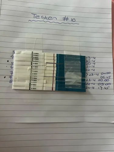 En zie tot mn schrik dat je wel 3x op een dag hebt gestest. Daarmee maak je jezelf echt gek. 1 test om de dag of per dag, met eerste urine in de ochtend, en het verder laten.