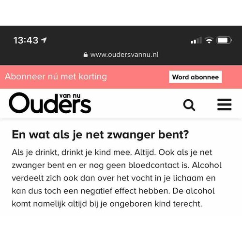 Nou bij ons eerste kindje wist ik niet eens dat ik zwanger was de eerste weken. Wij deden t veilig (pil en condoom) en waren ook nog maar net samen. Ik werkte nachtdienst in de horeca en we zopen wat af. Toen werd ik ineens steeds vermoeider. Kon altijd de 2e nachtdienst wel janken zo moe om maar niet te spreken hoe ik er zondags aan toe was. Toch maar ff bloed laten prikken en ik werd vrolijk opgebeld door de assistenten en gefeliciteerd. Echter gingen we toen voor de echo check ik bleek 6 weken zwanger maar het hartje klopte ontzettend langzaam. Aflopende zwangerschap gaf de gynaecoloog aan en ze zei waar we rekening mee moesten houden. Een week later weer een echo. Ik kan je zeggen dat een week lang duurt dan. En wat heb ik veel gehuild omdat ik me schuldig voelde over de drank! Het was mijn schuld dat de baby dood ging. Echter met de echo 7 weken laten zagen we een klein bewegend frummeltje met een prima kloppend hartje. Bleek dat die de week daarvoor opstartte.