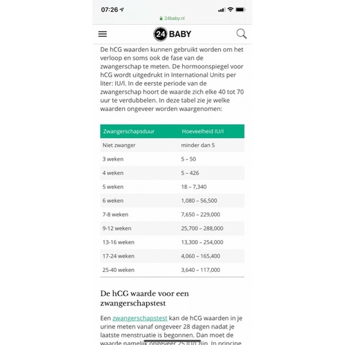 In de tabel zie je de “normaalwaarden” van HCG per week, ze lopen echt super veel uit elkaar dus verschilt echt enorm per persoon. Ik heb begin dit jaar een complete mola zwangerschap gehad en met bijna 12 weken (toen pas achter gekomen) was mijn HCG bijna 173000 dus volgens de tabel nogsteeds “normaal” dus zegt niet veel. Bij de een stijgt het sneller dan de ander.