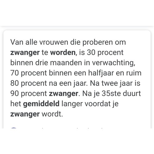 Ja deze statistieken wordt ik niet echt door gerustgesteld. Aangezien ik in ronde 6 zit. 70% is binnen een half jaar zwanger, 80% na een jaar. Betekend dus dat wanneer je na 6 maanden nog niet zwanger bent de kans nog 10% is om binnen het jaar zwanger te worden? Of lees ik het dan verkeerd? 🙈