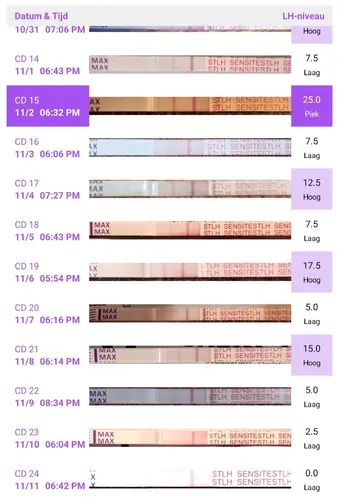 Mmm het zou kunnen dat je piek eerder of later was op 2 november. De test lijkt me namelijk nog net niet helemaal positief. Het kan ook dat je piek nog komt. Gemiddeld zitten er 14 dagen tussen ovulatie en menstruatie dus dan zou je piek eigenlijk nog moeten komen. Ik zou dus doortesten