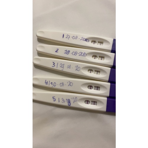 Ik ben sinds 27-08 begonnen met ovulatietesten (zie foto). Ik snap er niks meer van.. hij blijft continu positief. Kan het dat ik door de miskraam een hoge LH waarde heb?