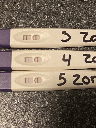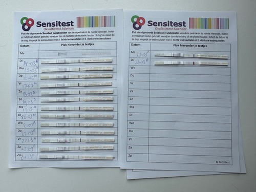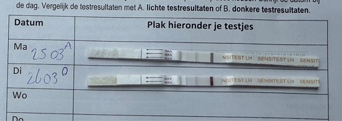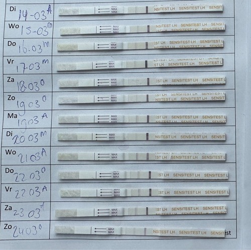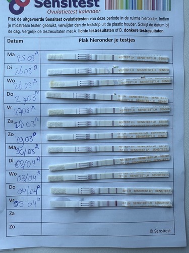 Het beste is 2 a 3 keer per dag te testen ivm het missen van je piek als die er maar 24uur is. Lijkt of je woensdag 21e een piek ging krijgen en die liep na donderdag weer af. Als je volgende keer dit weer ziet zou ik die dag nog eens testen om te zien of die donkerder wordt. Mijn piek was zaterdag en zondag liepen ze al weer af. Vrijdag had ik niet getest dus weet niet of de test toen ook al donkerder was.