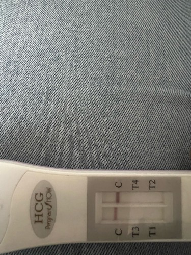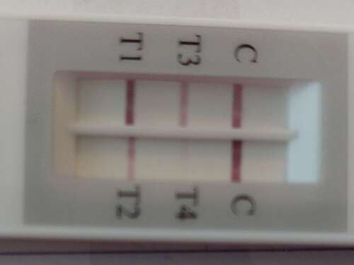 Dit is de kruidvat test met wekenindicator, wordt ook in NL verkocht. Ik zie op jouw test alleen 2 controlestreepjes, dus geen zwangerschap. Als je zwanger bent staat minimaal bij T1 ook een roze streep, en hoe verder je in de zwangerschap bent ook bij T2, T3 en T4. Zie hier een foto van mijn test toen ik bijna 6 weken zwanger was.