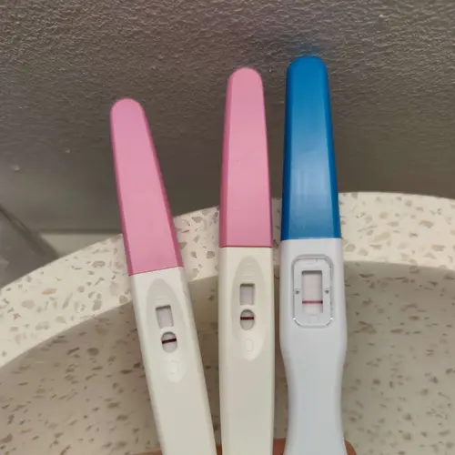Drie testen, omdat het heel licht is en ik het bijna niet durf te geloven. Maar ik denk dat ik wel mag zeggen dat ik zwanger ben, toch? 馃グ
