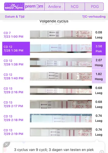 Je piek was inderdaad op cd12. Dit komt overeen met een vrij gemiddelde cyclus. Je ovuleert namelijk binnen 24 tot 48 uur, dus op cd13 of cd14 (29/30 juli). Een gemiddelde ovulatie vindt ook plaats op cd14 (halverwege een totale cyclus van gem. 28 dagen).