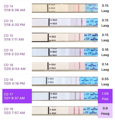 Welke dag ben je begonnen met testen? Kan het zijn dat je hem gemist hebt in het weekend van 7? En hoelang is normaal je cyclus, misschien moet hij nog komen? Op deze testen zie ik inderdaad geen piek, maar op dag 6 lijkt hij wel toegenomen, vandaar dat ik me afvraag of die misschien in het weekend van 7 is geweest.