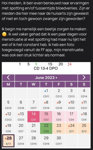Heb me er ook zorgen om gemaakt omdat het zwanger worden lang duurde. Uiteindelijk had het langer duren voor ik zwanger werd helemaal niks met mij te maken, maar met mijn partner. Heb dus wel ook allerlei onderzoeken gehad (niet naar het spotting perse, maar algemeen de vruchtbaarheid voordat je een traject in gaat en alles was goed bij mij).