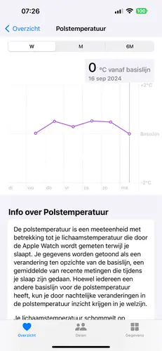 Je temperatuur is 0 van basislijn: dat houdt in dat je precies je ‘gemiddelde’ temperatuur hebt gehad die nacht. Als je naar onderen scrollt naar ‘toon alle gegevens’ kun je de daadwerkelijke temperatuur zien.