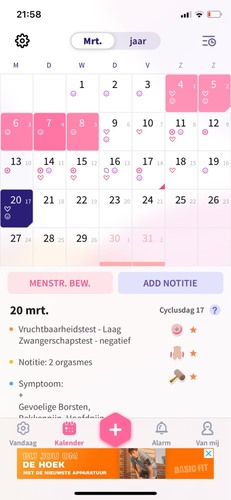 Oh maar de app is op dit moment alleen handig om in te zien wanneer je laatste menstruatie was. Een app berekent alleen aan de hand van gemiddeldes namelijk en soms kloppen die, maar in principe kan een app niet in je lichaam kijken. Dus de app is fijn voor hou vast wat betreft wanneer je menstruatie was, maar om je eisprong te vinden zijn ovulatietesten beter.