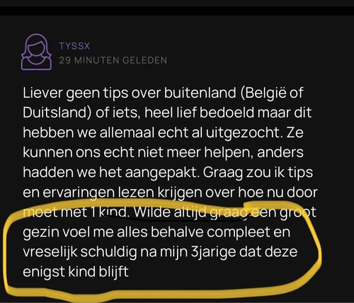 Liever geen tips over buitenland (België of Duitsland) of iets, heel lief bedoeld maar dit hebben we allemaal echt al uitgezocht. Ze kunnen ons echt niet meer helpen, anders hadden we het aangepakt. Graag zou ik tips en ervaringen lezen krijgen over hoe nu door moet met 1 kind. Wilde altijd graag een groot gezin voel me alles behalve compleet en vreselijk schuldig na mijn 3jarige dat deze enigst kind blijft