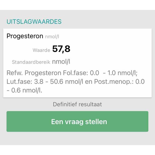 Je progesteron moet tussen de 3.8-50.6 zijn, deze is iets te hoog. Goed beeld van PCOS.