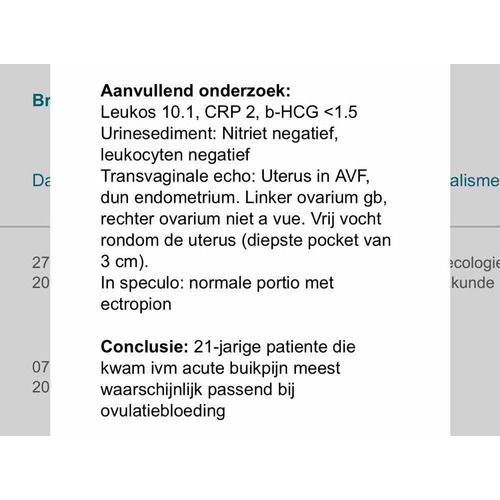 Hey, superlief dat je het vraagt. Mijn rechtereierstok was blijkbaar verstopt achter een plas bloed dus heb hem wel! En het is gewoon een ovulatiebloeding dat gewoon 3 weken pijn kan doen en mijn baarnmoeder gaat het bloed weer vanzelf opnemen. Dus heb pijnstilling gekregen etc. En ik heb een hele dunne baarnmoederslijmvlies waardoor het heel moeilijk gaat worden dat een eicel erin kan innestellen en daarvoor heb ik vervolg afspraak gekregen over een maand!