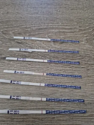 Van de 7 testjes zie ik met het blote oog op 6 stuks een licht streepje. Maar of dit echt iets is of ik het mij verbeeld, het een slechte innesteling is of wat dan ook... weten we dinsdag a.s. pas. Over 4 dagen dus pas (NOD).