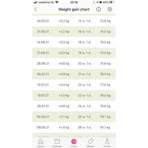 Dit is overzichtje wat ik in 10 weken ben aangekomen😬 Startgewicht was 66,8. Nu met 32 weken zit ik op 15,7kg erbij. Echt iedere vrouw is anders tijdens de zwangerschap.