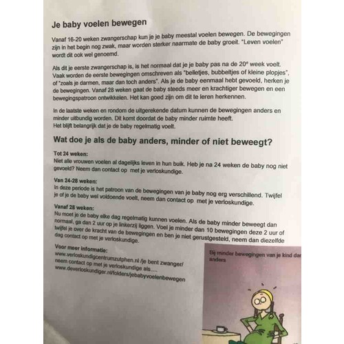 Als je je baby minder voelt dan anders. Eerst iets ziet drinken en op je linker zijde gaan liggen. Als je de baby niet voelt meteen aan de monitor gaan. Je kan nooit te veel bellen! Echt niet! Beter 10 keer te veel dan 1 keer te weinig