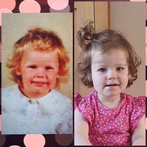 Zelfs de krulletjes zitten hier tzelfde. Ik links 2 jaar oud en zij rechts bij 18 maanden.