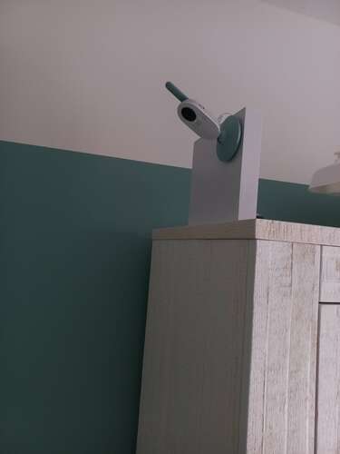 Wij hebben hem op een wat hogere kast staan en zo zien we het bedje helemaal van schuin boven. Hebben hem ook er recht voor staan gehad. En er zit bij ons ook aan de onderkant op het voetje een magneet dus kunnen hem ook op metalen oppervlakken hangen. Je kunt er ook zelf een magneet of haakje aan bevestigen. Wij hebben hem echt al op veel verschillende manieren gebruikt, ook op vakantie, hotelkamer, bij opa & oma etc... beetje creatief 😇