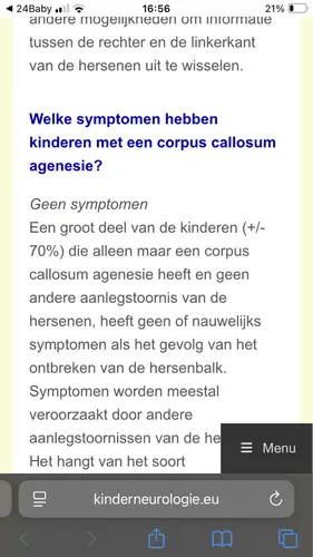 Die informatie zagen wij inderdaad ook, maar als ik op deze link (https://www.kinderneurologie.eu/ziektebeelden/aangeboren-afwijkingen/corpus-callosum-agenesie) kijk, zie ik voornamelijk de volgende informatie: