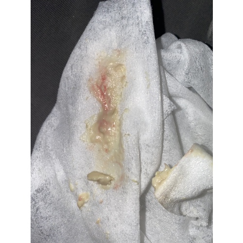 Morgen even je vk bellen. Er zit ook wat bloed bij volgens mij.