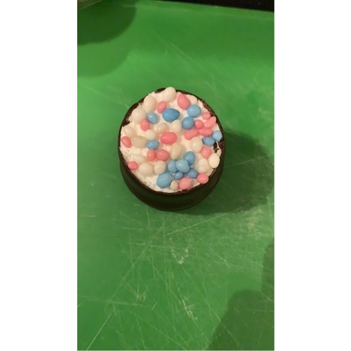 Oreo koekjes, in witte chocolade dippen en dan discodip naar keuze erop. Heb je in meer roze en meer blauwe variant in het taartschap.