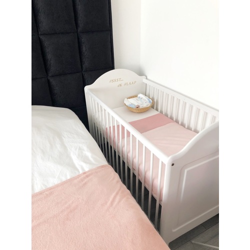 Gewoon het bedje naast ons bed (foto is van toen ik de co-sleeper net had vervangen door een groter bedje). Verschonen deden we eerst op een verschoontafel in onze kamer, maar sinds we een ladekast hebben, verschonen we op bed.