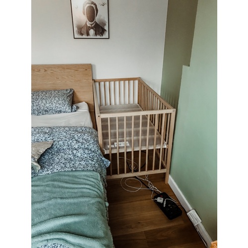 Ik heb aan de muur een ledikant, en naast het bed een co sleeper. Maar hij slaapt in mijn bed🙈