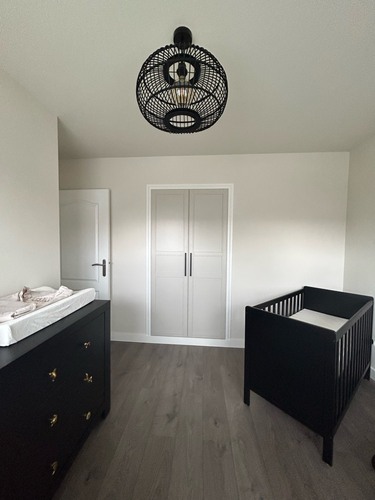Wij hebben er voor gekozen om alle muren + plafond en een licht beige/zand kleur te toen. En de muur tegen over de commode word nog opgeleukt met meisjes-achtige posters/muur cirkels. Her en der wil ik ook wat roze terug laten komen met andere leuke accessoires.