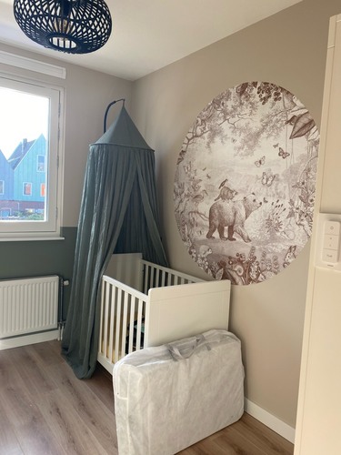 Kamer voor ons zoontje. De groene kleur loopt in de lambrisering door aan de andere kant van de kamer met dezelfde beige kleur erboven. Toch kleur maar heel rustig! :)