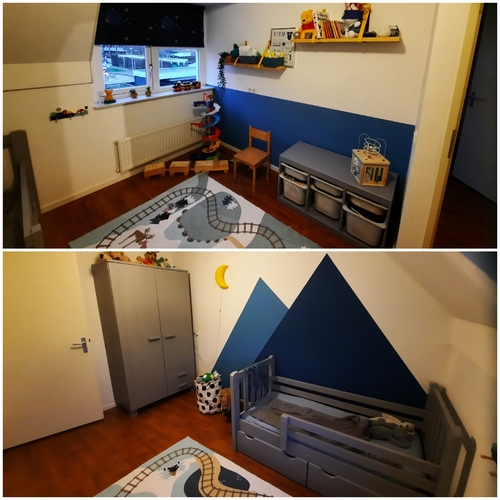 Hier een jungle kamer, met olijfgroen en blauwgrijs(meer grijs) op de muur. Heb losse neppe jungle bladeren toen der tijd bij action gehaald(sommige zijn afgevallen helaas)