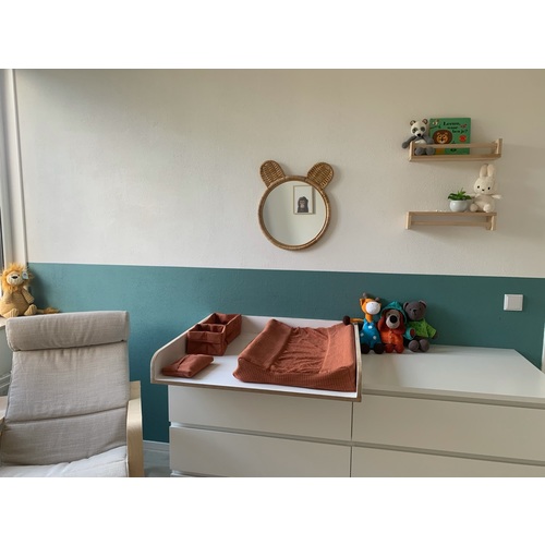 Wij hebben een kant groen met een sticker en de andere kant staat de commode en die is gewoon wit