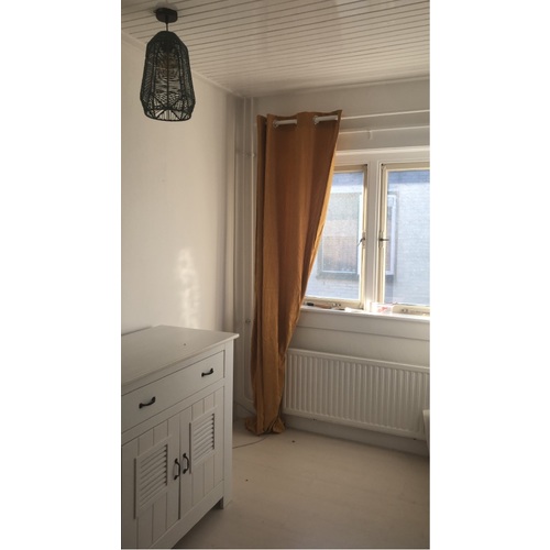 We zijn erg blij met de combi okergeel en grijs. Op het witte deel zit nu een muursticker en de gordijnen hangen nu natuurlijk niet meer zo in elkaar gebonden om de plooien erin te krijgen, maar je kunt maar 1 foto per bericht plaatsen :-)