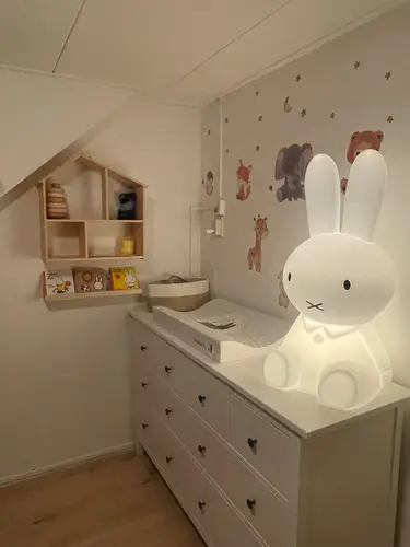 Je hebt ook heel leuke muurstickers die je verdeeld over de muur kunt plakken. En op een andere muur misschien een schilderijtje of fotolijstje in dezelfde kleuren/hetzelfde thema. Zo kun je het echt wel mooi aankleden met witte muren! Gordijnen doen ook wonderen. Ik zou wel een thema kiezen zodat je het met bepaalde kleuren wat kunt aankleden. Maar eerlijk gezegd vind ik een babykamer sowieso overrated, die van ons werd pas gebruikt toen onze dochter 1,5 was🤣