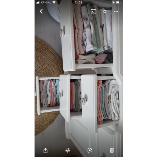 Ik had bij de eerste alles in de lades van commode. Een la met vestjes en shirts, een la met rompers korte mouw, rompers lange mouw en la met broekjes. Alles rechtop, zodat je alles kan zien en niet iets van onderop de stapel hoeft te frutsen.