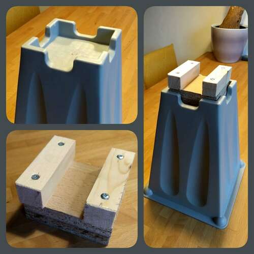 Mijn man had zulke houtjes gemaakt voor in de klossen. Tussen die balkjes in kon precies het hoofd-/voetbord van het bed. En dan 3 klossen en elke kant.