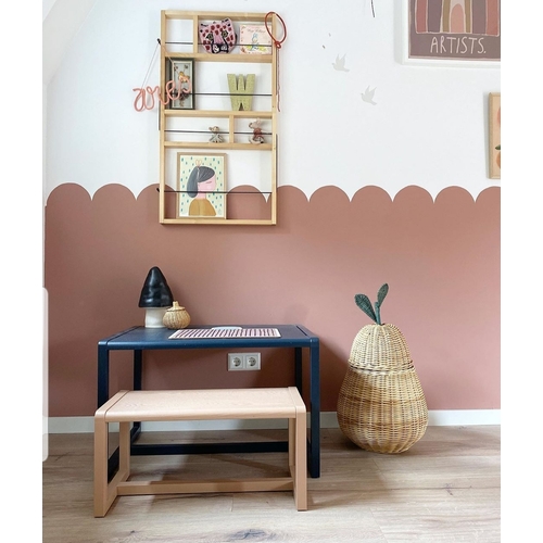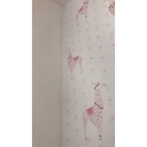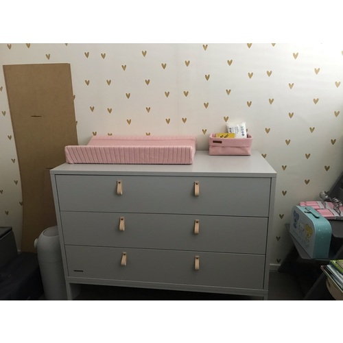 Wij hebben 1 muur behangen met BN Wallcoverings, collectie Smalltalk. De rest van de muren zijn wit. We wilde geen typisch meisjes behang en omdat de kamer verder rustig is, ook iets wat eruit springt. Voor nu heb ik het gecombineerd met oud roze.