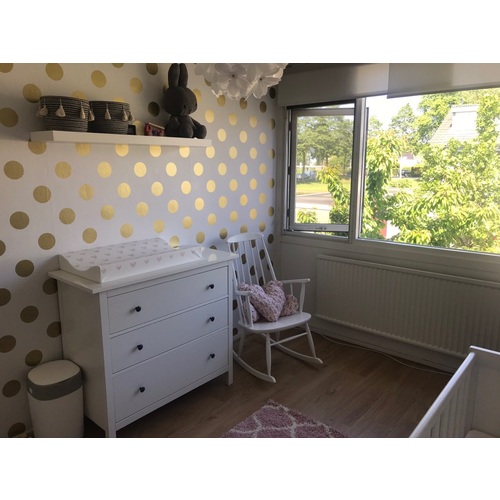 Wij hebben gouden stippen behang van Karwei in de kamer van onze dochter. De andere muren zijn wit en met accessoires zachtroze elementen.