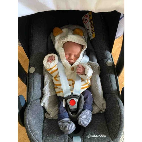 Eventueel een dekentje voor het stukje buiten over de gordel heen ‘instoppen’ en in de auto kan dat er dan weer af, anders is het ook te warm in de auto.