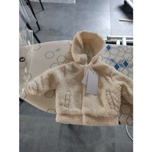 Dat jasje rekt wel wat mee 56 moet echt wel goed zijn. Hier hadden we een noppies jasje/vestje die je aan 2 kanten kon dragen maar dat was van kartoen dat kreeg je moeilijk aan het uit. Maar daarna eem z8 berenvestje gekocht zoiets als op de foto in maat 56 daar echt een tijd mee gedaan omdat die mouwen wat ruimer zijn dus krijg je het makkelijk aan en uit. En als het u toch tegen valt heb je zo een 62 gekocht.