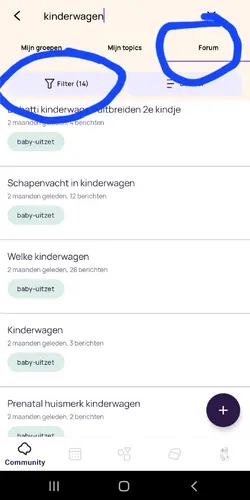 Ik ben nog niet helemaal thuis in de app.. ik heb het idee dat ik maar een beperkt gedeelte van de topics zie. Ik zit in een paar groepen waar ik dan de berichten van zie en andere groepen die ik nog zou kunnen toevoegen, maar verder niks. Als ik zoek op “kinderwagen” vind ik dan ook niks.