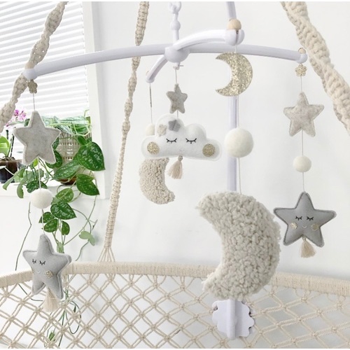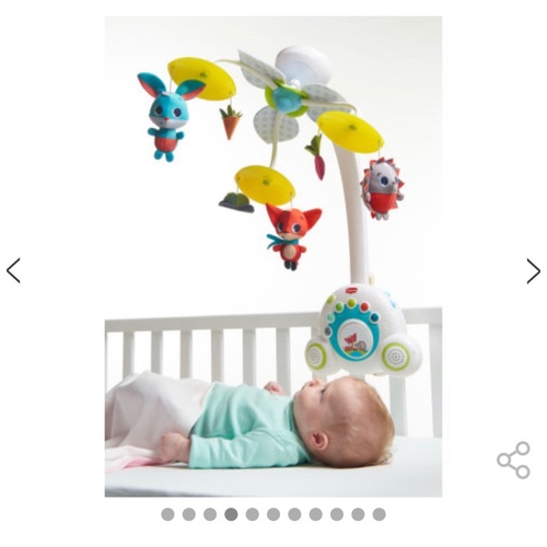 Wij hebben deze van tiny love. Eentje met zachte kleurtjes kon onze man écht niet bekoren. Ze zien graag wat! 😂 Deze speelt 20-30.minuten aan een stuk, alle verschillende deuntjes na elkaar als je wil. En doordat hij schuin hangt en de groene bladeren die je ziet kunnen draaien, bewegen de diertjes ook (ze 'kantelen').