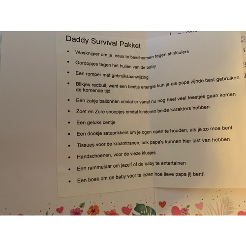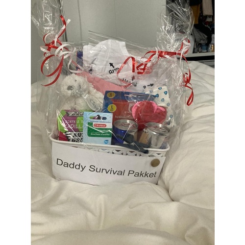 Ik had vorig jaar een pakket gemaakt met redbull, oordopjes, paracetamol. Maar ook een voorleesboek speciaal voor papa's, een washand om samen met de kleine te douche, dinner with dad eetset En tijdschriftjes voor het wachten tijdens de bevalling. 😊