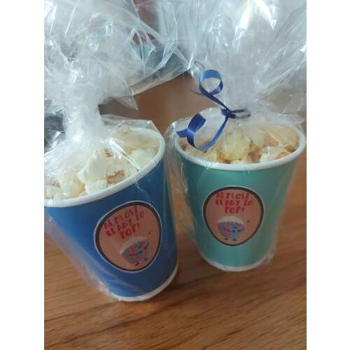 Ik heb dit in elkaar geknutseld, bekertjes en popcorn van de AH. De plaatjes erop zelf geprint en geplakt en toen leuk ingepakt.