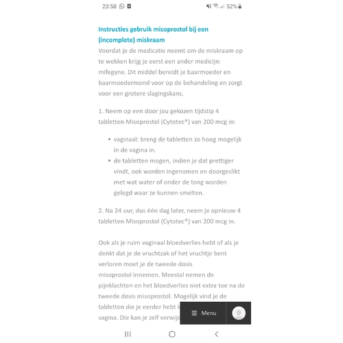 Ik had eerst een pil (mifegyne) deze moest ik oraal innemen. Dit maakte de baarmoedermond week. Na een aantal uren, geloof haast 1.5 dag later moest ik 4 tabletten cytotec of andere naam misoprostol vaginaal inbrengen.