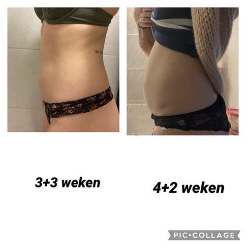 Bij mij werd het niet minder in ieder geval haha. Alleen maar langzaamaan iets dikker! Op een gegeven moment krijgt je buik wel een soort andere vorm, een andere bolling ofzo, en dan veranderd het echt in een babybuikje 🥰 maar zo leuk dat je nu al zo’n verschil ziet! Ik zou proberen elke week een foto te maken. Ik deed dit pas vanaf 24 weken, ook leuk om te zien, maar vind het wel jammer dat ik het begin mis haha.