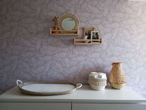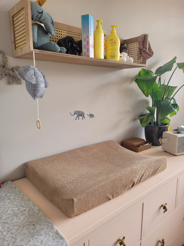 In het begin had ik een mandje met de luier-verschoon-essentials. Sinds ze kan draaien en pakken (en tegenwoordig op de grond gooien) staat die er niet meer. Ik heb ook plankjes en een spiegel maar daar trekt ze zich nu aan op dus de spiegel ook maar weggehaald 🥲 daar ging m’n pinterest kamer