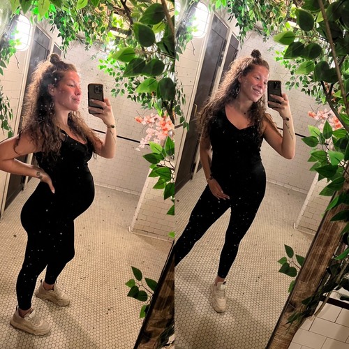 Ik loop nu, met bijna 33 weken, vooral rond in flared zwangerschapsbroeken. Een lekker stofje en veel stretch. Ik pas er nog makkelijk in met mijn buik. Op Vinted staan veel van dat soort broeken te koop. Ik heb zelf ook via Vinted een aantal flared broeken van Prenatal en die zitten erg fijn!