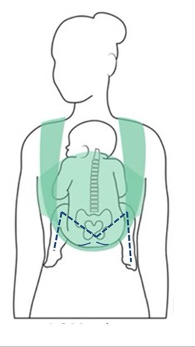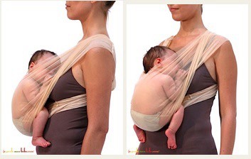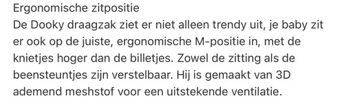 Het is een gokje natuurlijk. Maar de stof bij de billen lijkt erg stug. Een baby moet met de billen helemaal wegzakken in een draagzak en knietjes moeten hoger dan de billen (M-vorm, zie deze afbeelding). Ik zie niet voor me hoe dat in deze draagzak zou gaan. De stof van de draagzak die tussen hun beentjes komt moet bovendien precies in de knieholtes vallen (niet korter of langer) dus je moet dat stukje goed kunnen verstellen. Dat zie ik ook niet zo snel op die foto terug.