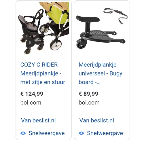 Zelf hebben wij de Joolz geo, onze dochter is 3 als straks haar broertje of zusje geboren wordt. Ik denk dat dat een meerijdplankje volstaat, omdat ze al aardig wat kan lopen. Maar dat zien wij dan tegen die tijd wel! ☺️ Je hebt ook meerijdplankjes waar op gezeten kan worden, misschien is dat iets?
