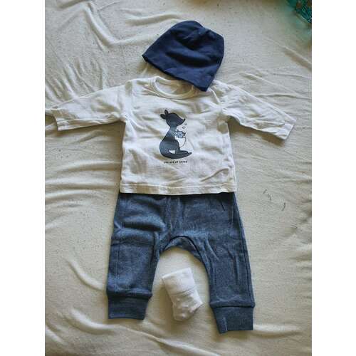 Dit wordt het 1e pakje, maat 50. Broekje is H&M, mutsje zat volgens mij in een van de zwangerschapsboxen en T-shirtje komt van de kringloop. Moet het nog wel even strijken hihi.